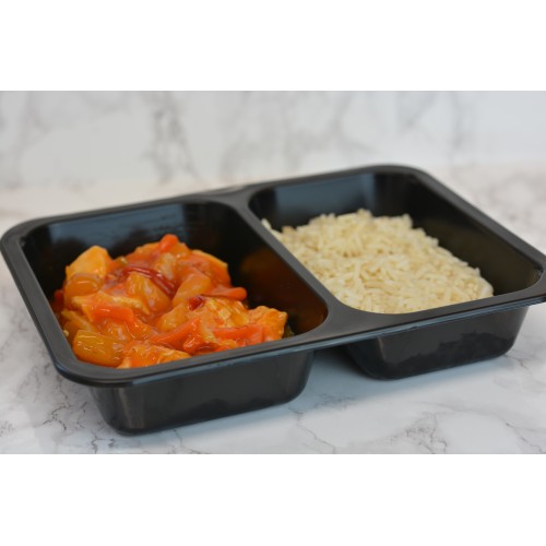 Maaltijd voor 1 persoon. Blokjes kipfilet in een zoetzuur sausje met fruit en groenten en een portie rijst.