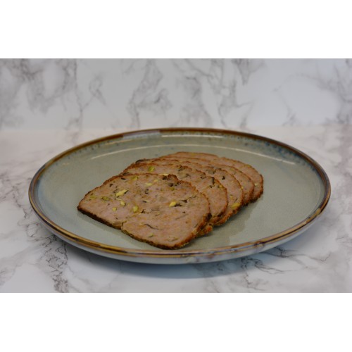 In eigen huis bereid gehaktbrood met bospaddenstoelen en pistachenoten.